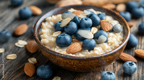 Oatmeal porridge with blueberries, almonds in bowl on wooden table background