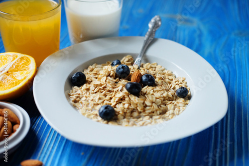 oatmeal with fresh berries on white plate with orange juice and milk, blue wooden background.