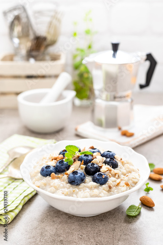 Oatmeal with fresh blueberry, almond nuts and honey for breakfast