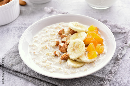 oatmeal, banana, porridge, oat, food, meal, breakfast, bowl, nut, table, muesli, closeup, grain, vegetarian, natural, plate, white, diet, snack, hot, organic, slice, dairy, morning, traditional, flake, milk, healthy, health food, lunch, bunting, vitamin, cookery, cooked, fruit, nourishment, eat, cereal, sugar, cinnamon, sweet, fiber, granola, fresh, tasty, almond