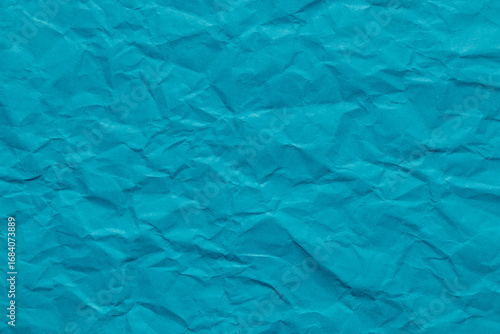 Ocean blue color crumpled paper texture, blank template wrinkly background with copy space