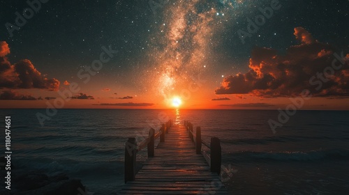 sunset, ocean, pier, milky way, beach, travel, sky, star, night, sunrise, water, dusk, dawn, landscape, nature, calm, serene, tranquil, peaceful, relaxing, romantic, hope, dream, freedom, inspiration, adventure, discovery, journey, exploration, solitude, escape, fantasy, magic, wonder, mystery, universe, cosmos, galaxy, celestial, astral, divine, spiritual, meditation, contemplation, peace, happiness, serenity, joy