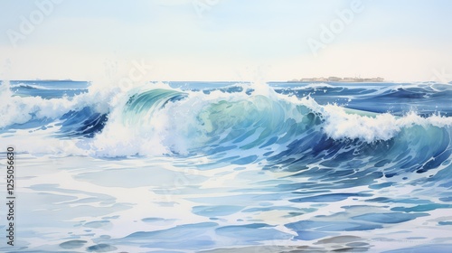 ocean, water, colours, beach, illustration, wave, painting, blue, sea, shore, coastline, landscape, scene, artist, texture, energy, movement, crashing, foam, sand, sky, horizon, creative, artistic, visual, expression, blend, shades, dynamic
