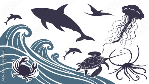 Ocean waves and marine life silhouettes vector illustration. Sea animals including shark, dolphin, turtle, crab, jellyfish.
