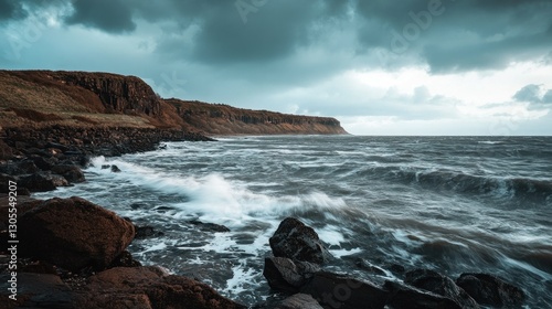 water, ocean, sea, wave, rock, coast, shore, cliff, landscape, cloud, sky, stormy, wind, beach, nature, weather, travel, scenic, dramatic, dark, moody, tranquil, coastal, powerful, rough, turbulent, motion, energy, beauty, grey, brown, horizon, distant, erosion, rugged, wild, desolate, huge, cold, isolated, stone, pebble, serene, crashing, overcast