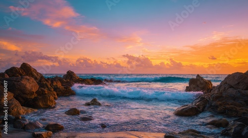 Ocean waves crashing on rocky shore at sunset vibrant sky rocks beach colorful