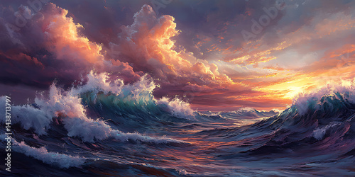 ocean, wave, sea, sunset, sky, cloud, water, foam, crest, horizon, blue, white, orange, purple, pink, yellow, storm, nature, landscape, art, painting, dramatic, colourful, evening, light, dark, power, beauty, scene, coast, seascape, vista, wild, energy, spray, motion, rush, force, heaven, peaceful, artwork, divine, serene, dreamy, majestic, celestial, aethereal, huge