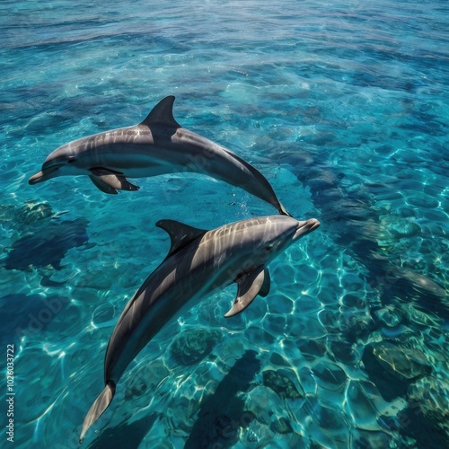 Oceanic Ballet: Two dolphins gracefully glide through the crystal-clear turquoise waters, their sleek bodies reflecting the sunlight in an underwater dance of elegance and freedom.