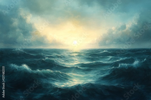 ocean, wave, sea, sunset, sunrise, sky, cloud, water, teal, gold, blue, green, painting, artwork, art, seascape, marin, maritime, nature, landscape, horizon, light, sun, colours, texture, calm, stormy, deep, huge, tranquil, peaceful, majestic, powerful, dramatic, beautiful, vibrant, atmospheric, impressionistic, realism, oil painting, canvas, fine art