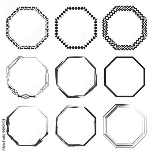 Octagonal frames set. Nine different octagon borders. Black and white vector illustrations. Simple geometric designs.