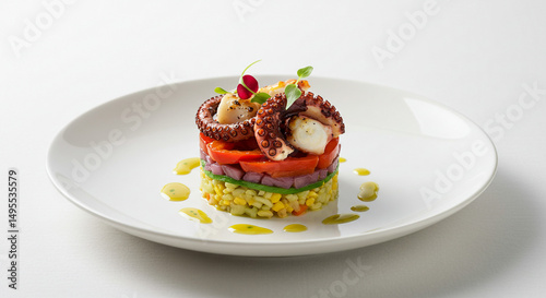 octopus, salad, stack, white plate, closeup, food, dish, cookery, epicure, eatery, meal, delicious, fresh, healthy, lunch, dinner, seafood, tomatoes, onion, rice, vegetable, presentation, fine dining, culinary, plate, tasty, elegant, modern, creative, chef, artistic, decoration, minimalist, studio shot, still life, gastronomy, food photography, white background