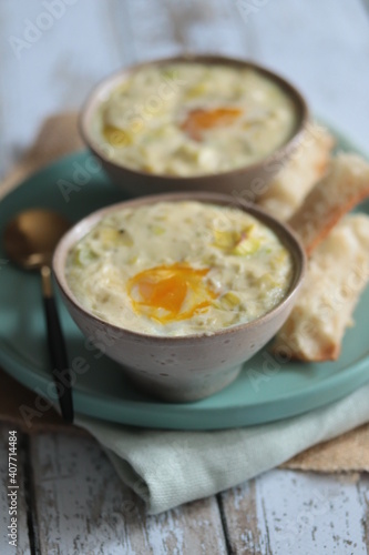 food, egg, vegetable, meal, cream, dinner, healthy, dish, breakfast, vegetarian, kitchen, leek, hot, white, creamy, bread, plate, delicious, spoon, epicure