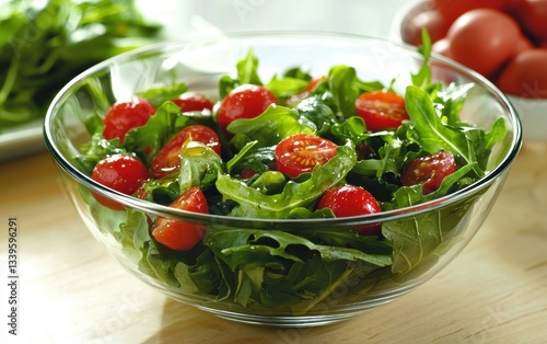 Of a bowl of fresh garden salad with cherry tomatoes and balsamic dressing on a pastel Easter table