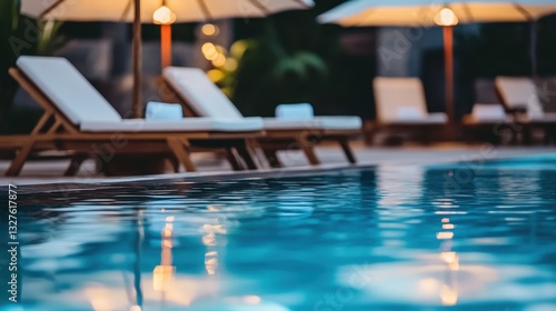 Of a Elegant hotel pool with wooden sun loungers, white umbrellas, and soft waves reflecting the evening lights