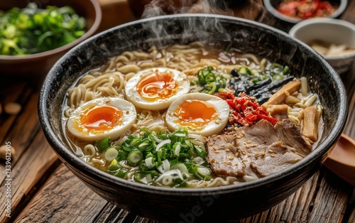 Of a steaming bowl of ramen with fresh ingredients on a textured wooden table