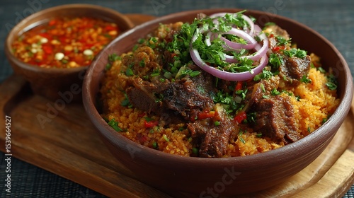 spicy sauce, meat dish, food photography, culinary arts, gastronomy, savoury, delicious, appetising, epicure, ethnic food, meal, lunch, dinner, spice, herb, parsley, wooden bowl, closeup, still life, rustic, warm tones, flavorful, dish, grain