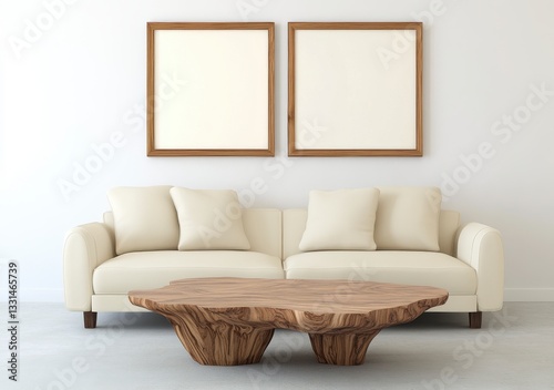 Off white couch with beige pillows sits before a rustic wooden coffee table, two empty square wooden frames adorn a white wall in a minimalist living room setting.