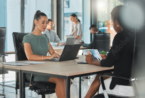 Office corporate business female employees, coworkers and team working online with digital electronics. Diverse advertising and social media marketing company or agency staff busy with client work