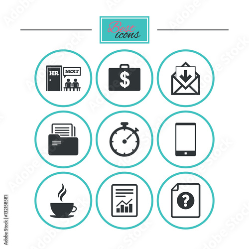 office, business, mail, case, chart, diplomat, dollar, arrow, analysis, phone, timer, call, smartphone, hot drink, file, page, tea, question, accounting, mark, speech, bubble, hr, document, device, memo, human, resource, icon, flat, signs, symbol, vector, circle, green, round, buttons, clean, classic, design, graphic, art
