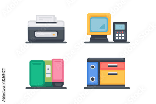 printer, computer, calculating machine, book, cabinet, office, equipment, icon, stationary, document, paper, screen, yellow, filing, drawer, organisation, storage, desktop, workplace, technology, device, electronic, stack, colourful, folder