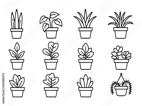 Office Plant Icons. Outline icon set of indoor office plants: snake plant, pothos, aloe vera, spider plant,