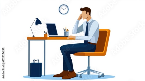 workplace, employee, manager, occupation, job, laptop, men at work, desk, professional, head, office, businessman, person, workload, computer, happy, id, raw, illustration, man, business, cartoon, holding, young, character, concept, v, design, style, vector, background, table, ar, flat