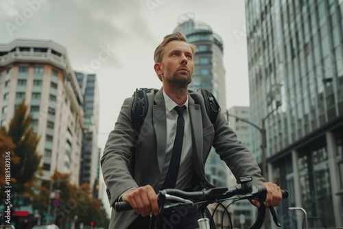 Office worker in a business suit riding a bicycle through the city on Car-Free Day
