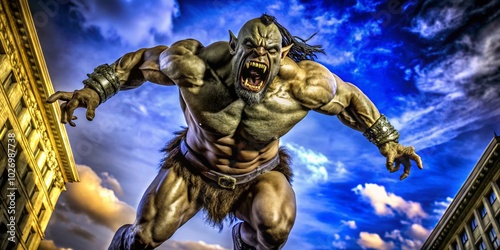 ogre, man, jumping, smash, photo, action, dynamic, muscular, fierce, white background, graffiti, urban, building, energy, motion, intense, powerful, fantasy, creature, adventure, vibrant, dramatic, strength, contrast, impact, character, imaginary, scene, storytelling, environment, epic, surreal, bold, creative, art, exploration, culture, urban decay, illustration, design, visual, unique, artistic