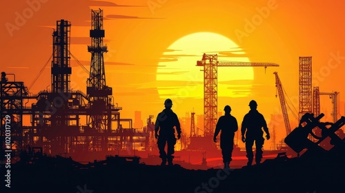 Oil and gas workers silhouetted against a sunrise, industrial scene with rigs and machinery in outline