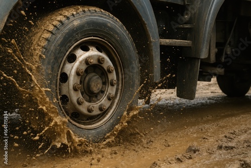 Oil logistics network. Mud splashes around a truck tire on a rough, wet surface.