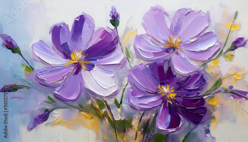 Oil painting of purple flowers on white canvas. Palette knife technique. Hand drawn botanical art.