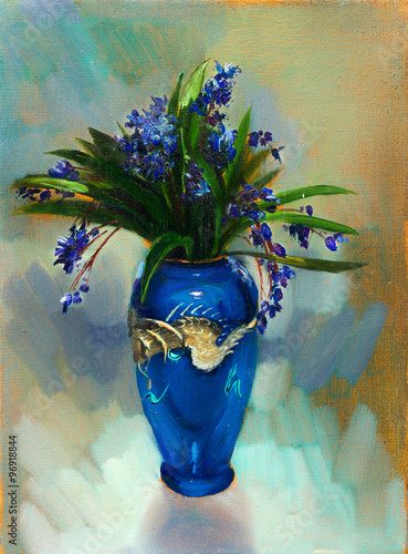 Oil painting still life with blue flowers in the Chinese vase with dragon On Canvas with texture in colored background