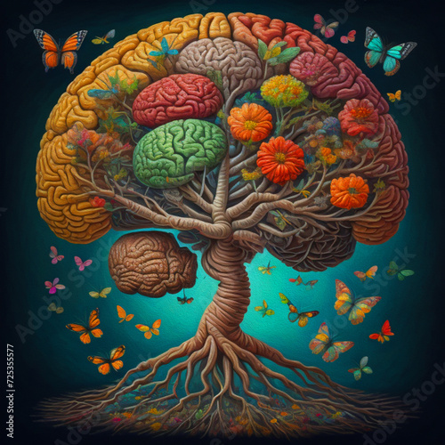 Oil painting,Human brain tree with flowers and butterflies, idea concept of thinking hope freedom and mind.