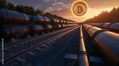 Oil pipeline network, cryptocurrency, sunset, tracks
