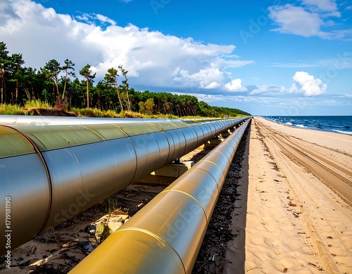 pipeline, beach, ocean, sky, cloud, pipe, nature, industry, infrastructure, transport, energy, coast, sand, sunlight, summer, metal, yellow, grey, landscape, horizon, forest, tree, wind, support, path, transportation, utility, resource, environment, technology