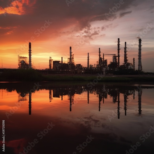 oil refinery during sunset, industrial machinery is set against a clear sky. generative ai