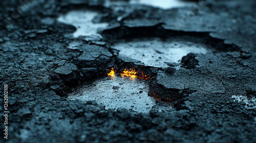 Oil spills on an asphalt road, symbolizing environmental degradation and pollution. The reflective surface adds a chaotic, dangerous vibe to the scene, highlighting the destructive impact of modern in