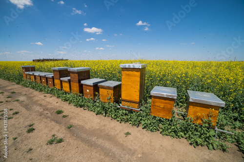 beehive, apiculture, rapeseed, plantation, honey, production, field, box, bee, hive, apiary, flying, pollination, apiculture, nature, plant, cultivate, agriculture, cultivated land, industry, rural scene, green, blue, sky, farm, landscape, springtime, wooden, grass, insect, yellow, meadow, wood, no people, sunny, day