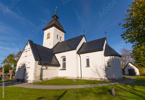 Old 1100s white stone church Hilleshögs Kyrka in the district Svartsjö a sunny autumn day in Stockholm