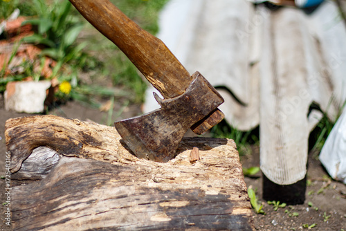 Old axe stuck in wooden log, outdoor firewood chopping, vintage rural woodcutting tool
