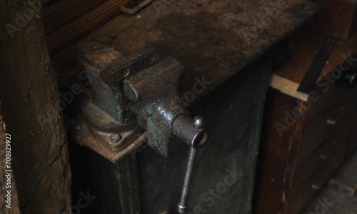 old bench vise on the workplace in an old workshop. dark vintage photo.