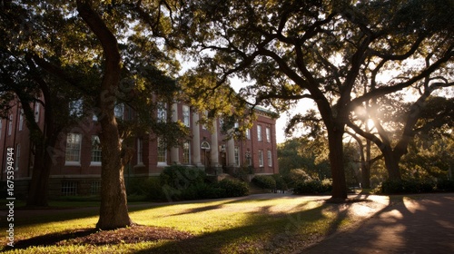 Old brick college hall surrounded by large trees with sunlight filtering through branches, creating serene atmosphere. scene captures beauty of nature and architecture harmoniously