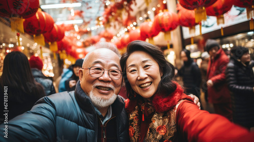 Old couple with Chinese traditional clothing, celebrating Chinese new year