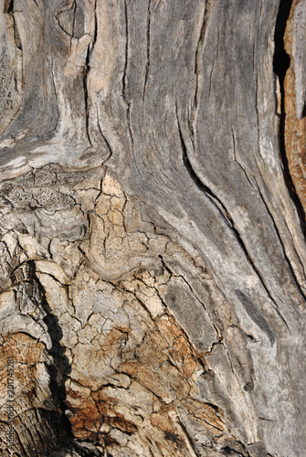 Old cracks wavy lines in tree trunk textured, blurry background, vertical close up detail