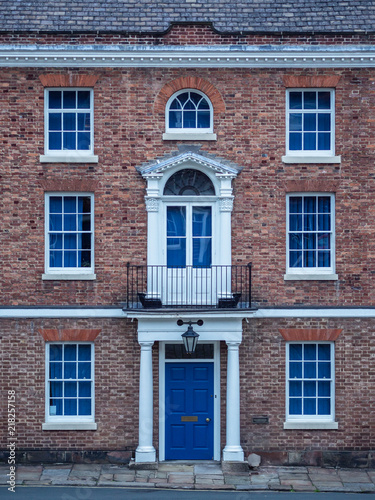 Old European brick facade with windows and colmns in a symmetrical style