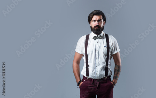 old fashioned bearded hipster. trendy man in suspenders and bow tie. confident and elegant man in classical wear. masculinity and charisma. formal party dress code. copy space