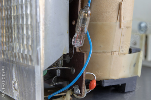 Old flash lamps on a metal table. Photo accessories from central europe.