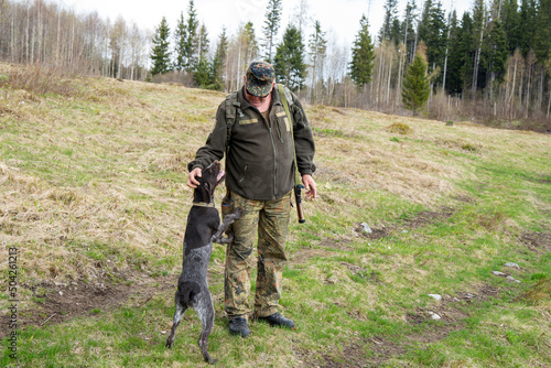 Old Hunter in the woods with his dog. Male hunter hunting with his hunting dog outdoors. German wirehaired pointer. Hunter with his shotgun in middle of nature.