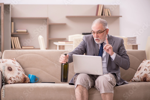 old, businessman, man, employee, boss, business, adviser, working, from, home, house, computer, laptop, online, cyberspace, call, calling, video, telecom, meeting, conference, teleconference, discussing, explaining, virtual, funny, cautioning, addicted, addiction, addict, bottle, wine, whiskey, whiskey, alcohol, alcoholic, hangover, drunk, glasses, booze, drunken, alcoholism, drinking, drink, pissed, remote, virus