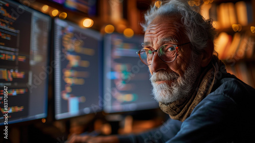elderly, man, programming, computer, coding, senior, technology, typing, screen, software, sharpened, concentrated, developer, aged, laptop, wisdom, learning, modern, keyboard, cyberspace, life events, digital, innovation, cognition, mature, intelligent, skilful, thoughtful, persistence, dedication, determined, work, tech, determination, perseverance, futuristic